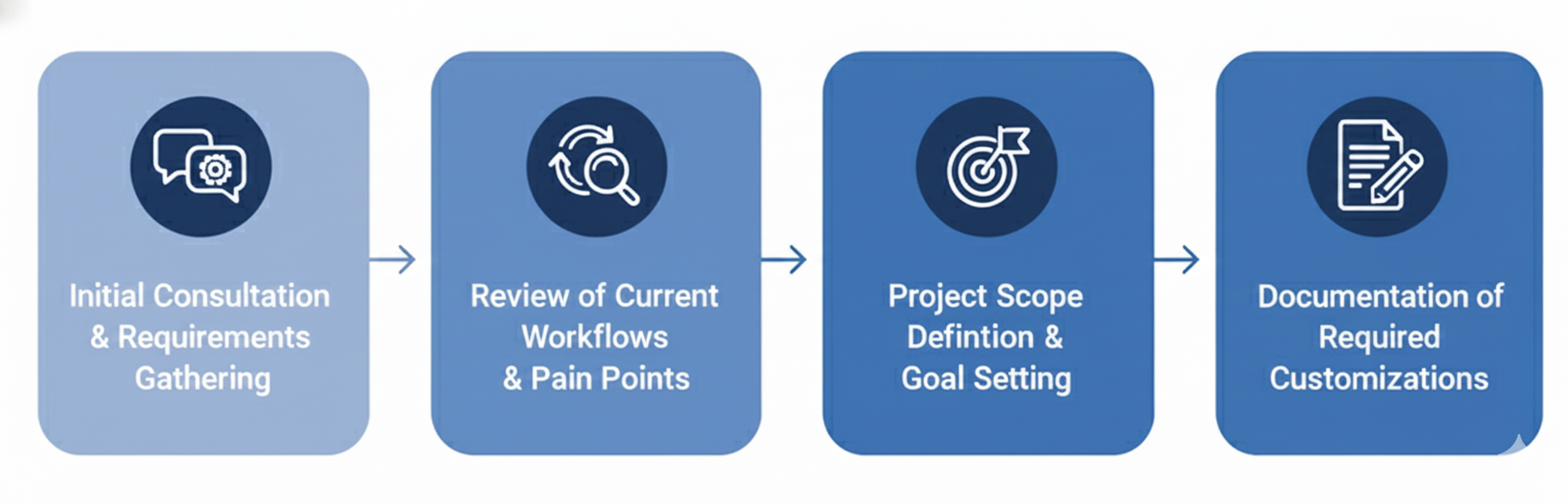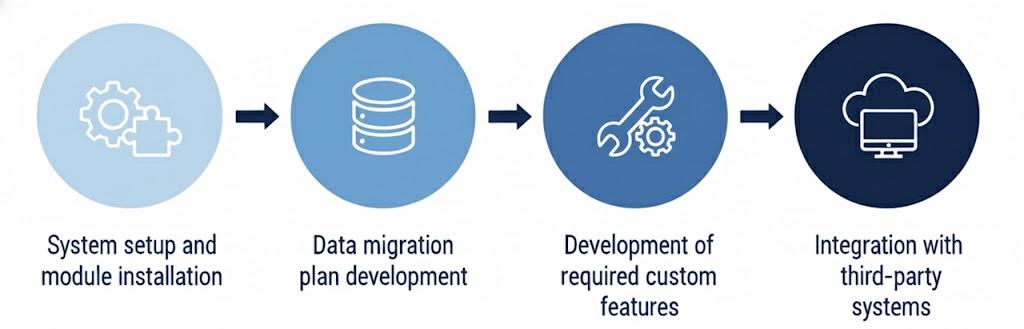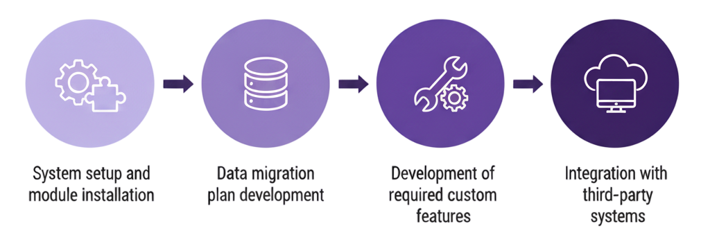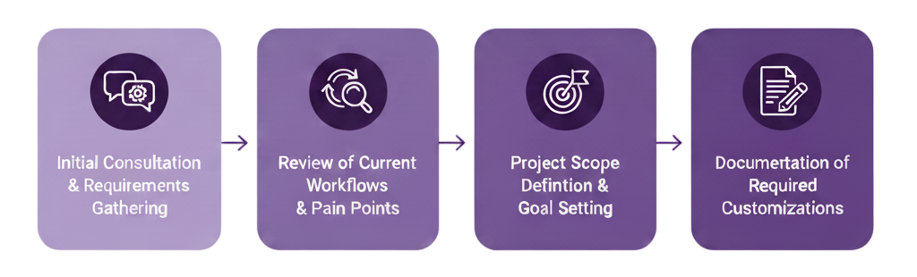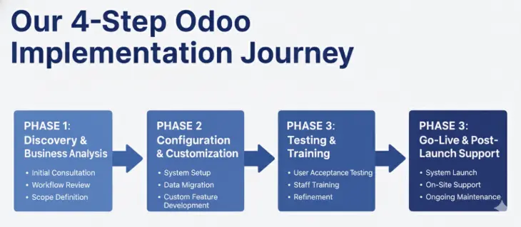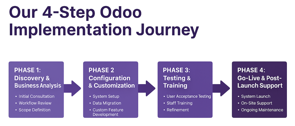 At Vraja Technologies, we believe a successful Odoo implementation starts with a clear, strategic plan. Our overall philosophy is centered on a structured, four-step journey designed to turn your business vision into a functional reality. This framework isn't just a process; it's a partnership. We guide you through each phase, ensuring transparency, collaboration, and a perfect fit for your unique business needs. We eliminate the guesswork and provide a predictable path to your digital transformation.