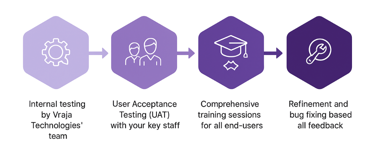 With your Odoo system configured and customized, this crucial phase focuses on validation and empowerment. Our goal is to ensure the system is robust, bug-free, and perfectly aligned with your business processes, while simultaneously preparing your team for a smooth transition. Through rigorous testing and comprehensive training, we make sure every user is confident and proficient, guaranteeing that your new Odoo environment is ready for optimal performance from day one.