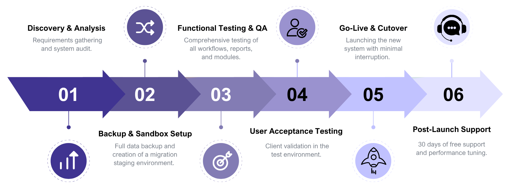 Zero-Disruption Approach We perform the migration on a secure staging environment, minimizing cutover time to under 24 hours (or state a specific low time).