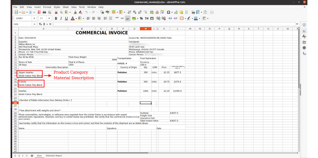 A solution was developed to generate commercial invoice reports in Excel format. These reports include all necessary information—product details, total packages, weight, address, etc.—and can be easily modified if needed by the user before finalizing.